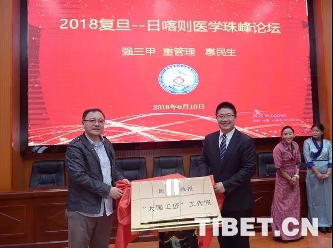 圖為復(fù)旦-日喀則醫(yī)學(xué)高峰論壇上,日喀則市人民醫(yī)院龍子雯與周平紅教授一同為周平紅-大國(guó)工匠工作室掛牌。日喀則市人民醫(yī)院供圖