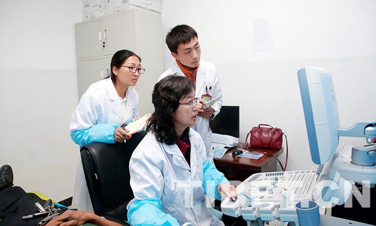 首都醫(yī)科大學(xué)附屬北京天壇醫(yī)院超聲科的何銀鳳給當(dāng)?shù)氐尼t(yī)護(hù)人員演示超聲檢查基本操作。攝影:陳衛(wèi)國