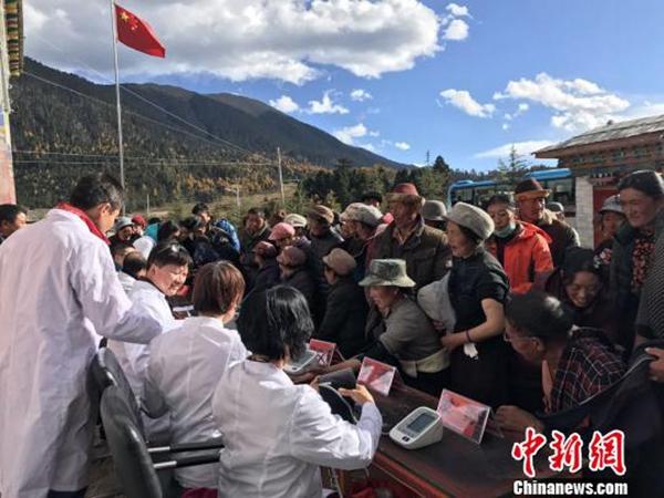 圖為援藏醫(yī)生為林芝農(nóng)牧民義診贈藥。圖片來源:中新網(wǎng) 攝影:張寧