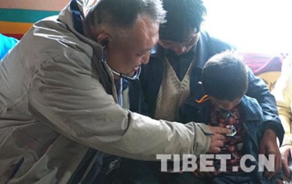 圖為北京安貞醫(yī)院心臟外科中心主任醫(yī)師趙鐵夫為已接受手術(shù)的先心病患兒旦增羅布聽診 攝影:吳建穎