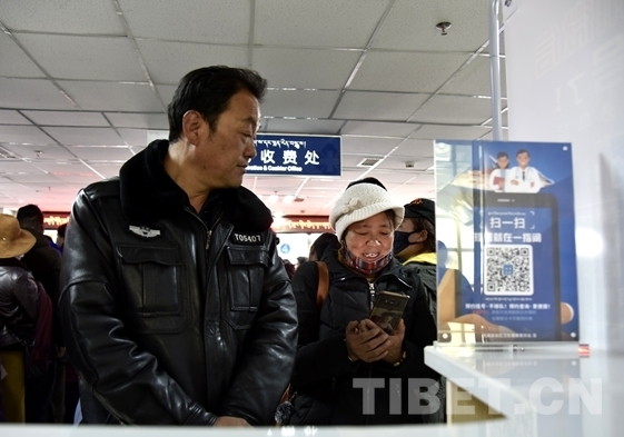 圖為西藏自治區(qū)人民醫(yī)院工作人員正在指導(dǎo)前來就診的群眾使用手機(jī)微信掛號。