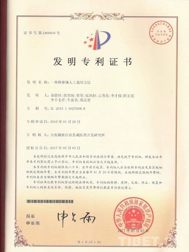 圖為天??h藏醫(yī)藥開(kāi)發(fā)研究所發(fā)明的“一種鐵棒錘人工栽培方法”獲得了國(guó)家知識(shí)產(chǎn)權(quán)局發(fā)明專利。