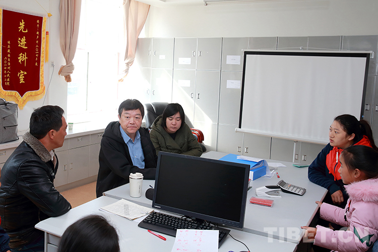 圖為王非(左二)向符合救助要求的患兒家屬講解手術(shù)治療的相關(guān)注意問題 攝影:陳衛(wèi)國