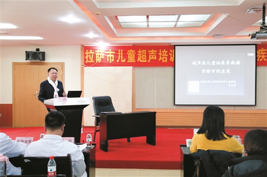 近日,拉薩市人民醫(yī)院舉行兒童泌尿系統(tǒng)疾病診治學(xué)術(shù)會(huì)。圖為賈立群教授就超聲在兒童泌尿系統(tǒng)疾病診斷中的應(yīng)用與現(xiàn)場人員交流。(市人民醫(yī)院供圖)