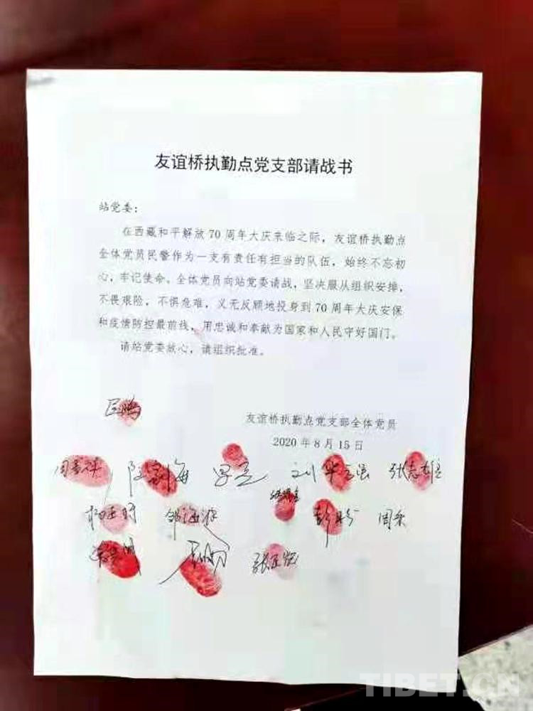 8月15日,聶拉木出入境邊防檢查站友誼橋執(zhí)勤點18名黨員民警在接受抗疫命令后,18名隊員在界碑前列隊,舉起右拳,鄭重宣誓,踴躍請戰(zhàn)?!霸谝咔榉揽毓ぷ髦?,我自愿申請參與到國門一線的疫情防控工作,到口岸一線去,這是我的職責(zé)和使命……”剛分配到單位的新警李東洪在請戰(zhàn)書中寫道。