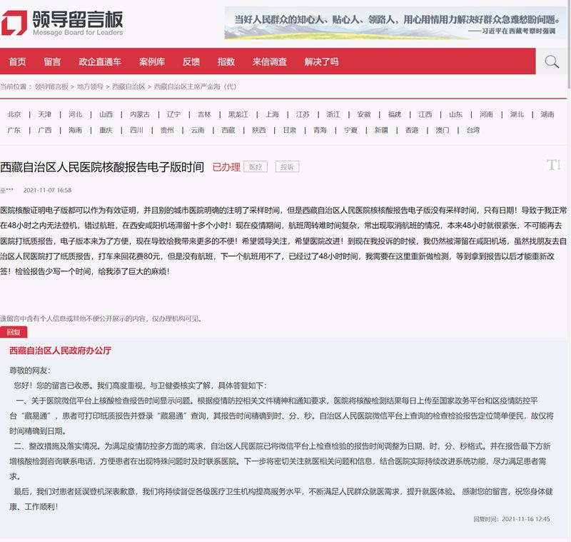 “醫(yī)院核酸證明電子版都可以作為有效證明,但是西藏自治區(qū)人民醫(yī)院的核酸檢測報告電子版沒有標(biāo)注具體采樣時間,只有日期,導(dǎo)致我在48小時之內(nèi)無法登機(jī),錯過航班……現(xiàn)在疫情期間,航班周轉(zhuǎn)難、時間復(fù)雜……電子版本來是為了方便,現(xiàn)在卻給我?guī)砀嗖槐恪边@是11月7日,西藏網(wǎng)民通過人民網(wǎng)“領(lǐng)導(dǎo)留言板”反映的問題。據(jù)悉,該網(wǎng)民因一張核酸檢測報告被滯留機(jī)場,耽誤行程,給日常出行造成了不便。