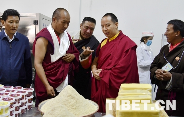 在雪林斯布牧場專業(yè)合作社考察調研過程中,十一世班禪通過參觀宣傳展板、聽取相關負責人匯報、參觀乳制品加工廠房等,詳細了解合作社的生產管理及運營。每到一處宣傳展板前,十一世班禪都停留片刻,仔細聆聽相關負責人的介紹,并針對一些細節(jié)問題進行詳細詢問。在參觀乳制品加工廠時,十一世班禪對車間里擺放的酥油筒產生了濃厚的興趣,饒有興致地手握長柄活塞,打起了酥油。看到乳制品加工廠里生產出的牦牛奶渣、酥油和酸奶,十一世班禪還品嘗了奶渣。