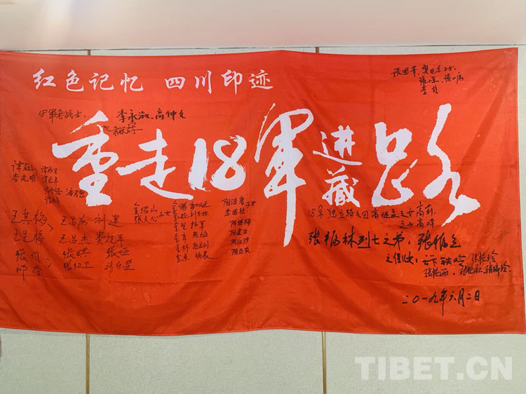 圖為十八軍老戰(zhàn)士及十八軍后代在“重走十八軍進藏路”隊旗上簽字留念。