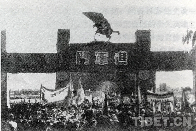 下午四點(diǎn),部隊(duì)開(kāi)始進(jìn)入進(jìn)軍西藏誓師大會(huì)會(huì)場(chǎng)。進(jìn)軍門(mén)上方,一旗、一人、一馬,士氣高昂、整裝待發(fā);進(jìn)軍門(mén)前,打著紅綠標(biāo)語(yǔ)的各界人士和群眾高呼著:“進(jìn)軍西藏,你們走到哪里,我們支持到哪里!”整整兩萬(wàn)人的部隊(duì)和群眾陸續(xù)通過(guò)特意布置的進(jìn)軍門(mén)進(jìn)入布滿紅色標(biāo)語(yǔ)的三蘇公園。