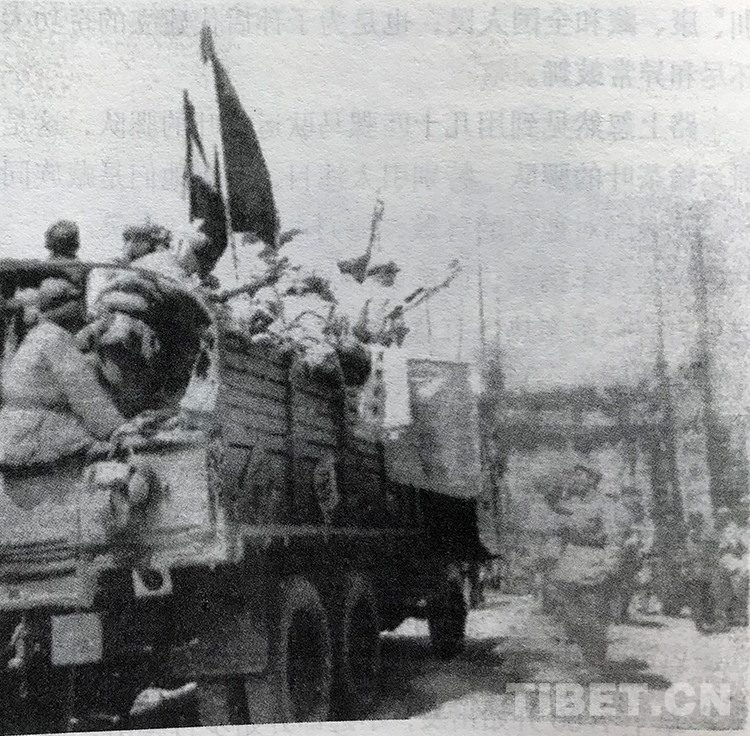 魏克在日記中寫(xiě)道:“滿載著進(jìn)軍英雄們的車(chē)隊(duì),被沿途歡送的人群包圍起來(lái)了,許多青年男女跑上來(lái),在汽車(chē)上貼滿了紅綠標(biāo)語(yǔ),送上一碗碗茶水,將一把把香煙撒在車(chē)廂上,鮮花、紙花、小旗子插滿了車(chē)的四周?!D銈兤扉_(kāi)得勝,馬到成功’和‘迅速解放西藏人民’的口號(hào)聲此起彼伏、響徹云霄。汽車(chē)慢慢地從一個(gè)個(gè)彩門(mén)下通過(guò),被歡呼的群眾送了一程又一程?!?/p>