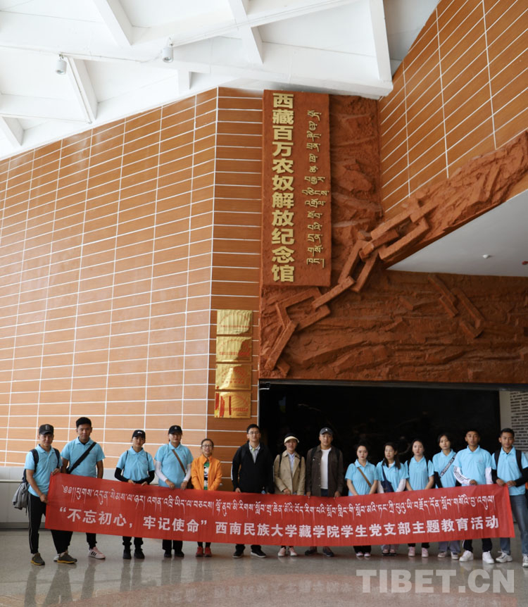圖為暑期實(shí)踐團(tuán)師生代表在西藏百萬農(nóng)奴解放紀(jì)念館前