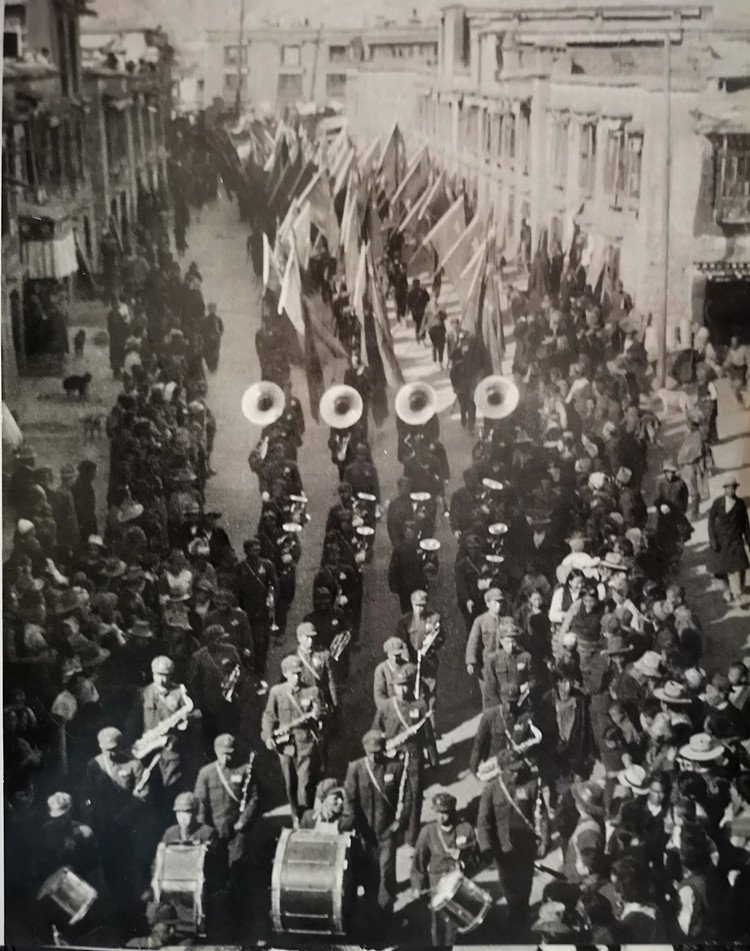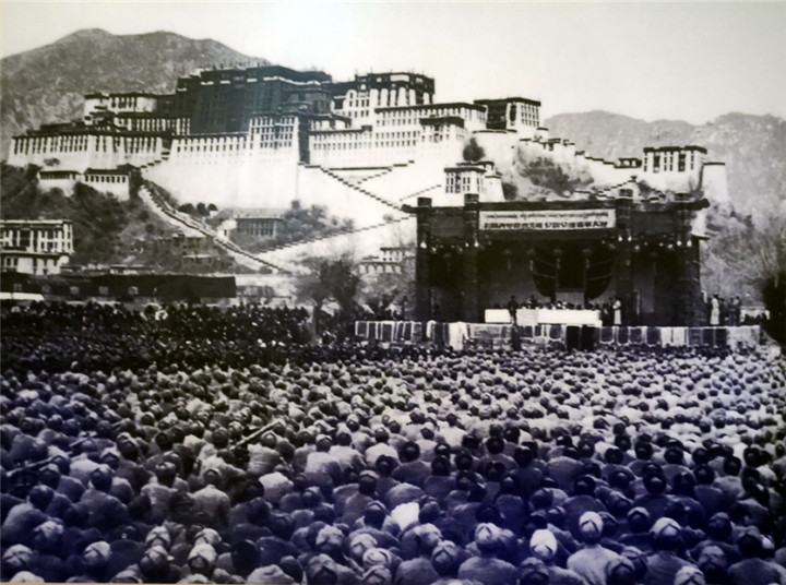 圖為1954年12月25日,在拉薩舉行的慶??挡毓罚ń翊ú毓罚?、青藏公路通車典禮大會(huì)。翻拍:李元梅