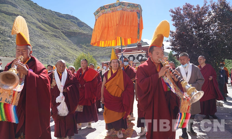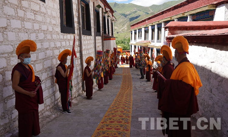 圖為8月5日,曲水縣熱堆寺僧眾列隊迎接十一世班禪的到來 攝影:王淑