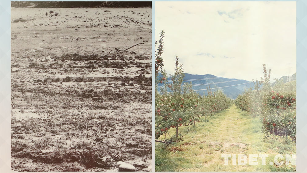 左圖,過去嘎拉村采摘園改造前的荒地;右圖,現(xiàn)在嘎拉村實施觀光采摘園項目。 孔夏翻拍自嘎拉村紅色研學主題教育展覽館