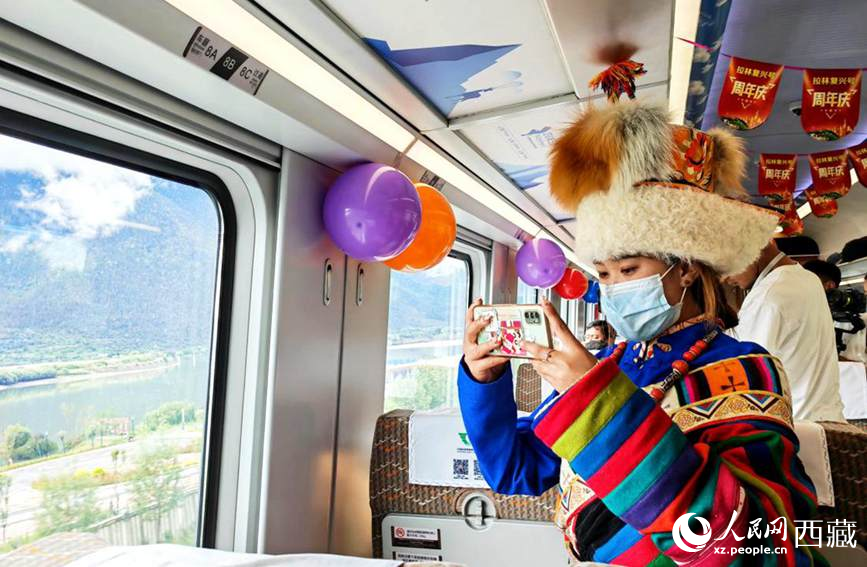 圖為拉林鐵路開通一周年,游客用手機拍下沿途風景。人民網(wǎng) 李海霞/攝