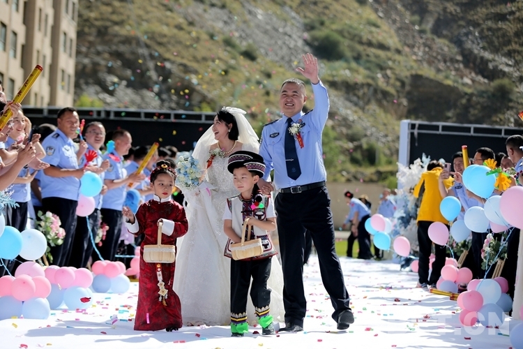 戍守邊境是使命,與相濡以沫的另一半攜手戍邊則成了最特別的浪漫。在婚禮現場,有一對穿著彝族和藏族服飾的花童引人注目?;ㄍ砗蟮男吕珊挠钍菑脑氐搅舨氐囊妥迕窬?,而新娘次旦央宗則是土生土長的藏族民警。這對“新人”的聯(lián)姻,既體現了民族團結與融合,更展示了西藏移民管理警察扎根奉獻邊疆的誓言和決心。