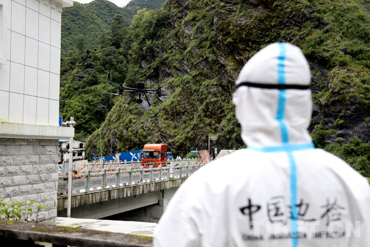 圖為民警正在使用無人機(jī)對(duì)貨運(yùn)通關(guān)現(xiàn)場(chǎng)進(jìn)行實(shí)時(shí)監(jiān)測(cè) 攝影:尼瑪?shù)┰?/p>