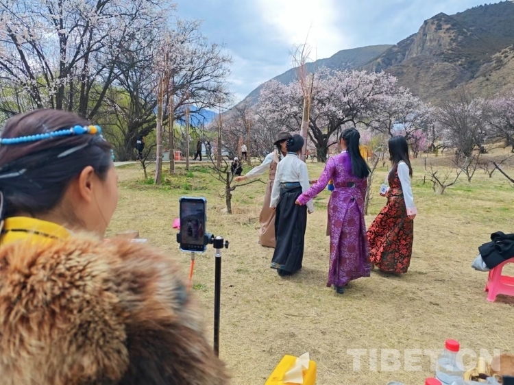 圖為林芝市職業(yè)技術(shù)學(xué)校的學(xué)生們在嘎拉桃花村進行直播