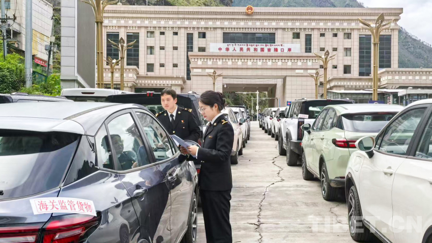 圖為海關(guān)工作人員在吉隆口岸對出口新能源汽車進(jìn)行查驗(yàn) 圖片由拉薩海關(guān)提供