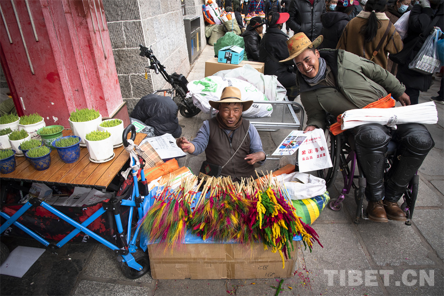 普瓊,來自日喀則市江孜縣,在八廓商城南門前經(jīng)營著自己的“羅薩梅朵”小攤。初見普瓊,我們被他沖著鏡頭的燦爛笑容所吸引。細(xì)細(xì)觀察,普瓊坐在地上的身高卻比別人矮了一大截?!拔覀儚睦_堆龍德慶的批發(fā)市場上買來這批‘羅薩梅朵’在此銷售,就希望能夠在年前的這段時(shí)間多賺些小錢補(bǔ)貼家用,所有人都想在新年之時(shí)過個(gè)充裕的‘好年’,不是嗎?”普瓊因一次意外高位截癱,失去雙腿的他并沒有消沉。他選擇積極面對生活,用自己的雙手和命運(yùn)抗?fàn)?,用?jiān)強(qiáng)和勤勞讓自己和全家過上更好的生活。與普瓊不幸的經(jīng)歷相比,我們每個(gè)人過的每個(gè)年何嘗不都是一個(gè)個(gè)“好年”呢?普瓊對生活的那種熱愛,對明天會更好的堅(jiān)定,何嘗不是我們對每一個(gè)“好年”所孜孜追求的呢?