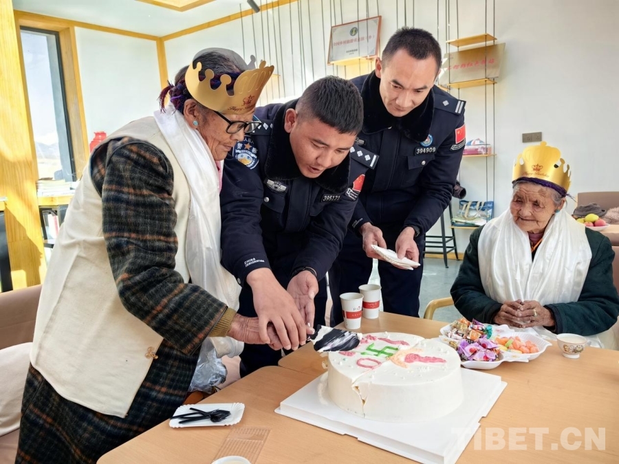 活動(dòng)中,警民攜手為老人們精心準(zhǔn)備了一場(chǎng)慶祝派對(duì),邊防民警、社區(qū)兩委班子成員、駐村工作隊(duì)隊(duì)員為老人獻(xiàn)上祝福的歌曲,定做精美的蛋糕,穿上代表高壽的藏式服裝等,并與老人們嘮家常,傾聽(tīng)他們的生活故事和需求。