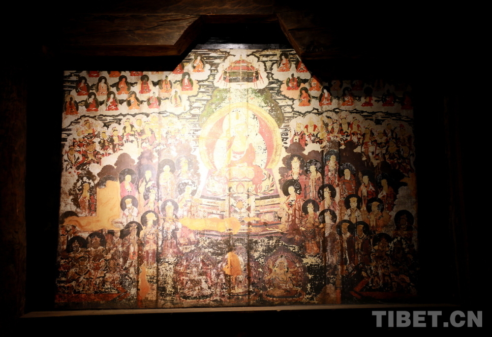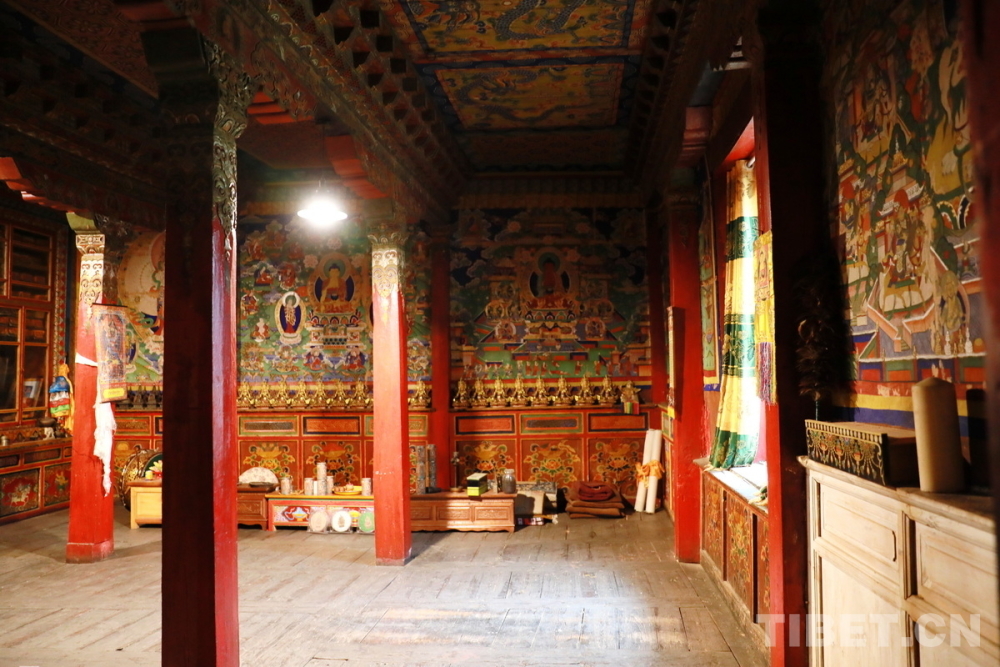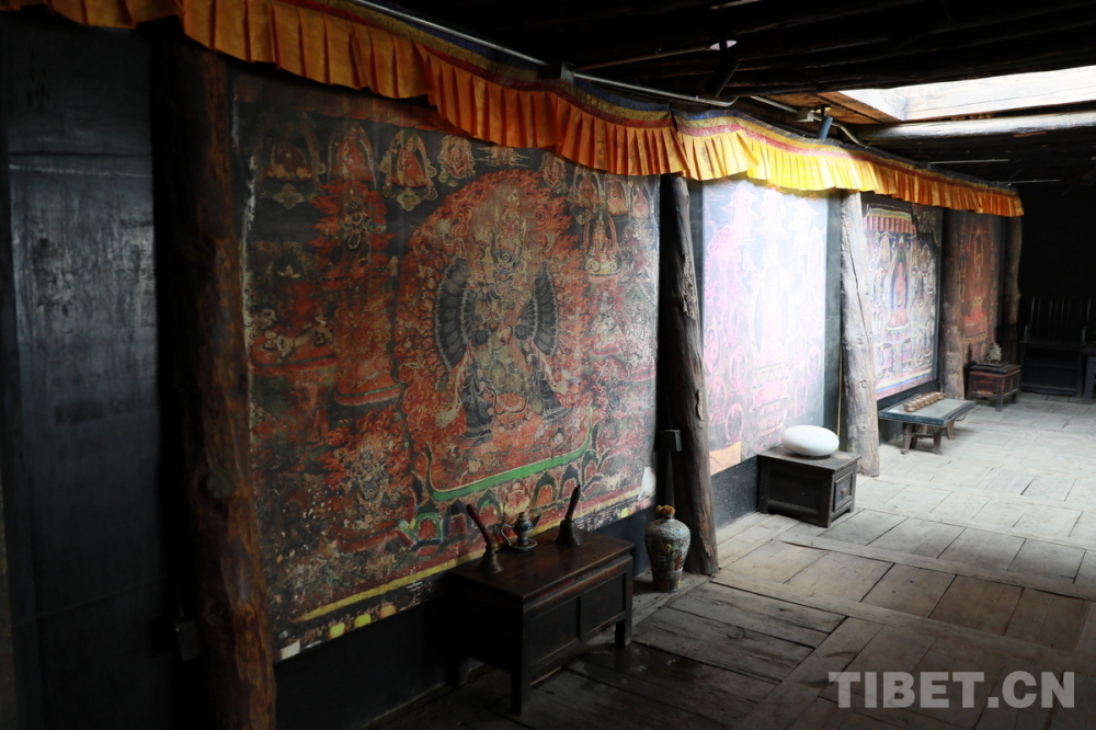 宗薩木府最驚艷的是其經(jīng)堂中歷經(jīng)380余年歷史仍色彩絢麗、保存完整的整堂壁畫。新中國成立后,宗薩木府曾被收歸公有,許多無房的當(dāng)?shù)刎毨罕姳话才抛∵M(jìn)了這里?!拔母铩睍r(shí)期,宗薩木府的經(jīng)堂被作為村里的倉庫,人們用報(bào)紙糊住壁畫,使這些藝術(shù)珍品沒有受到“破四舊”的影響。