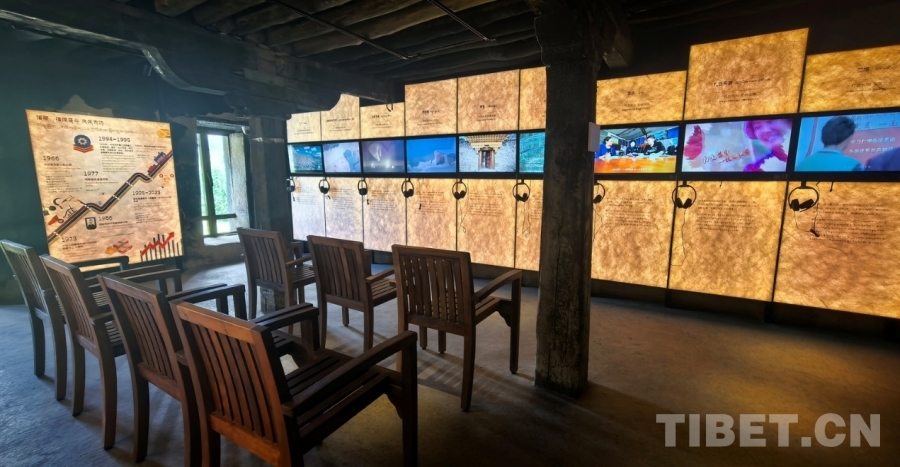 圖為強吉莊園公共文化活動中心二層通過影音設(shè)備講述新時代為建設(shè)社會主義現(xiàn)代化新西藏做出杰出貢獻(xiàn)的人們的故事 攝影:劉莉