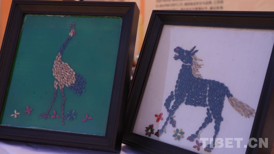圖為林周縣籮曾繪畫工作室負責(zé)人仁青多吉用青稞粒創(chuàng)作的文創(chuàng)產(chǎn)品