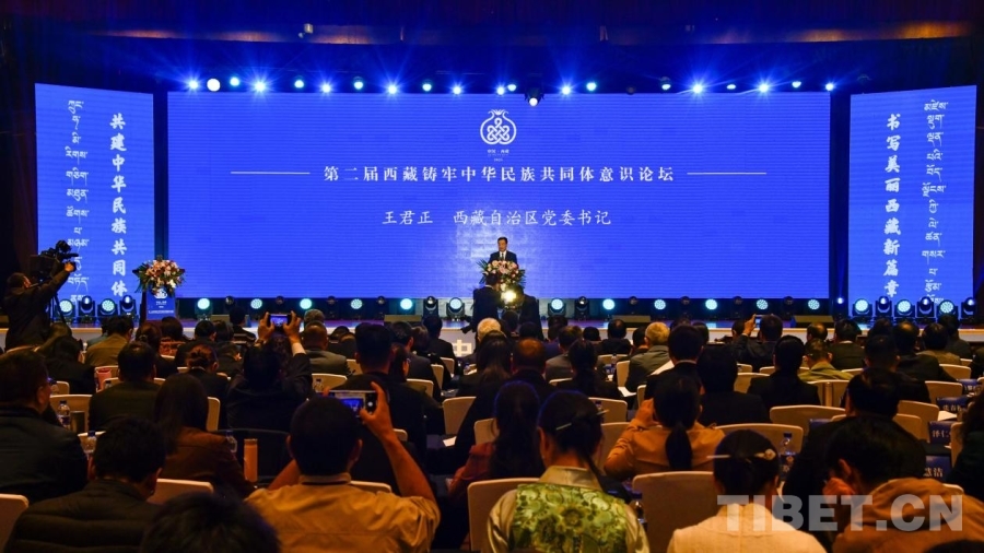 圖為第二屆西藏鑄牢中華民族共同體意識論壇現(xiàn)場西藏自治區(qū)黨委書記王君正致辭 攝影:趙振宇