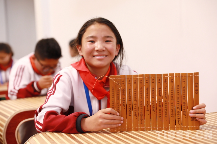 “子曰:‘學(xué)而不思則罔,思而不學(xué)則殆?!?jiàn)賢思齊焉,見(jiàn)不賢而內(nèi)自省也?!卟换螅收卟粦n(yōu),勇者不懼。’……”竹簡(jiǎn)手工課堂上,孩子們將打磨光滑的刻字竹片用牛筋線(xiàn)仔細(xì)編連成冊(cè)?!巴瑢W(xué)們要記住,繩子折疊后要保持長(zhǎng)度一致,位于竹簡(jiǎn)上方的繩子向上穿孔,下面的繩子向下穿孔而過(guò),這樣能保證竹片緊密相連,即‘上上下下’原則。”在老師悉心的指導(dǎo)與幫助下,孩子們稚嫩的雙手上下翻飛,很快便將散落的竹簡(jiǎn)按照刻字排列整齊,并編織成冊(cè)。來(lái)自阿里噶爾縣昆莎鄉(xiāng)的巴桑卓瑪說(shuō)道:“編竹簡(jiǎn)需要繩子不斷交織,與藏族的紡織工藝有些相似。通過(guò)這次手工,我感受到了古人的智慧與中國(guó)傳統(tǒng)文化的神奇奧秘?!闭窍裰窈?jiǎn)、紙張一樣的文化載體,才讓先賢哲人的深邃智慧以文字的形式流傳至今,被千年后的人們傳承誦讀。
