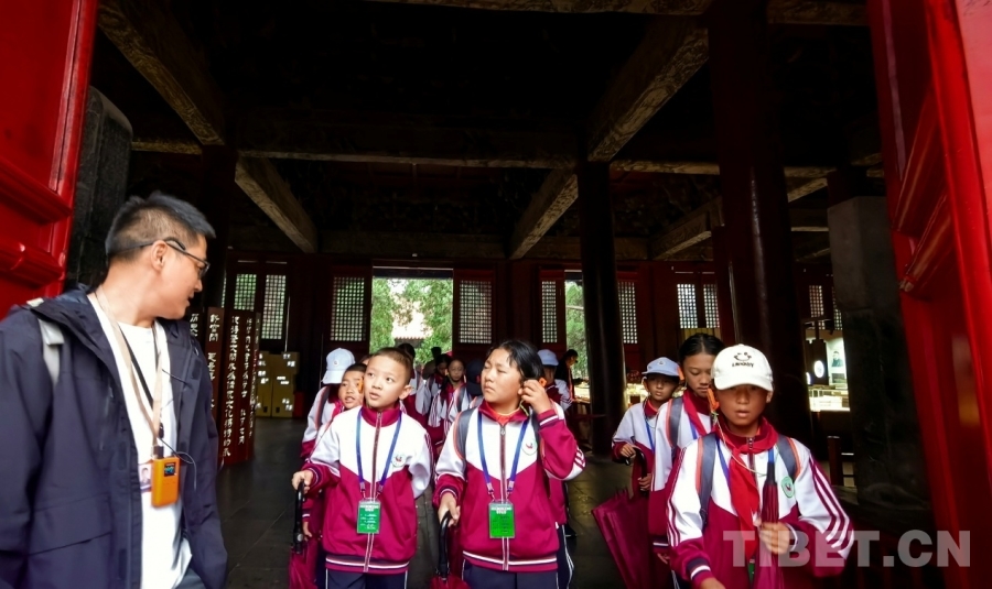 圖為西藏阿里噶爾縣孔繁森小學(xué)的孩子們在山東曲阜孔廟大成殿外聆聽講解并與講解員交流 攝影:劉莉