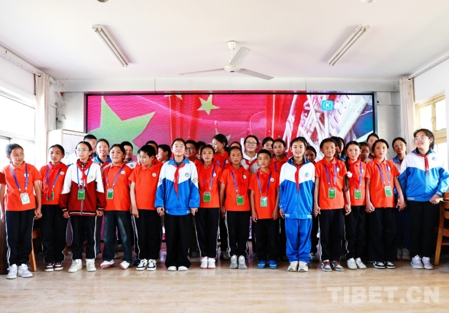 圖為西藏阿里噶爾縣孔繁森小學(xué)和山東聊城堂邑鎮(zhèn)中心小學(xué)的孩子們合唱中國少年先鋒隊隊歌《我們是共產(chǎn)主義接班人》 攝影:劉莉