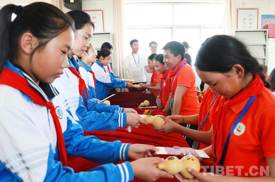 圖為堂邑鎮(zhèn)中心小學(xué)學(xué)生向西藏阿里噶爾縣孔繁森小學(xué)學(xué)生贈送小禮物 攝影:劉莉