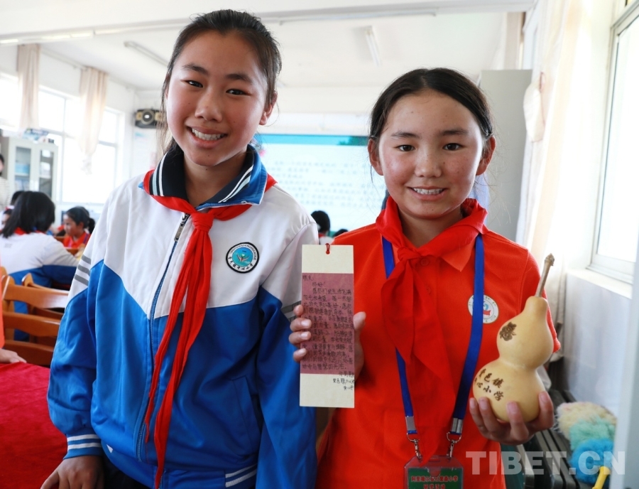 圖為山東聊城堂邑鎮(zhèn)中心小學(xué)學(xué)生向西藏阿里噶爾縣孔繁森小學(xué)的小伙伴贈(zèng)送并介紹媽媽親手制作的向日葵小擺件 攝影:劉莉