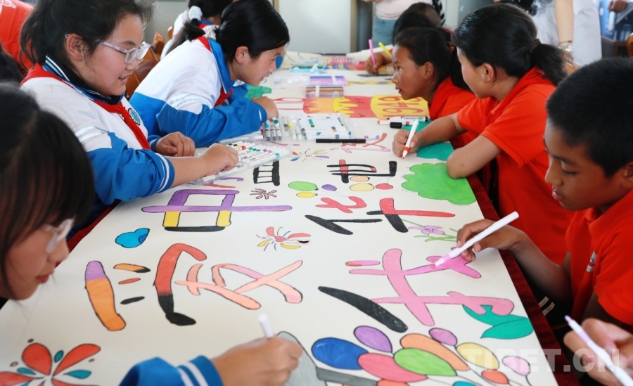 圖為西藏阿里噶爾縣孔繁森小學(xué)、山東聊城堂邑鎮(zhèn)中心小學(xué)的孩子們共同創(chuàng)作迎國慶主題畫卷 攝影:劉莉