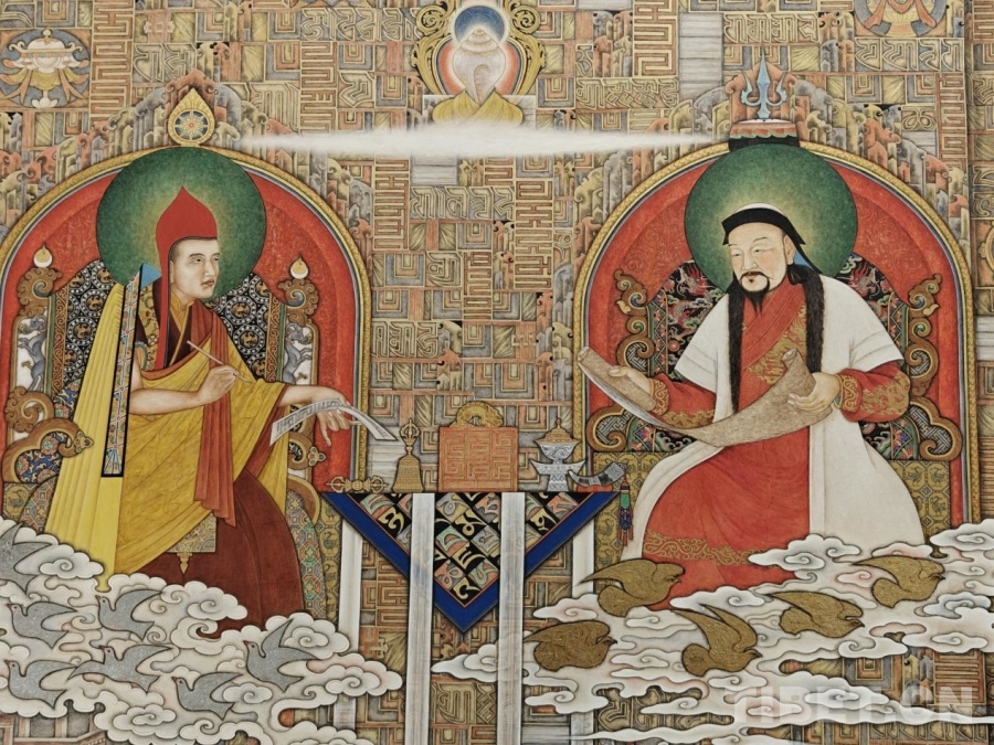 圖為展覽現(xiàn)場展出的作品《忽必烈與帝師八思巴》
