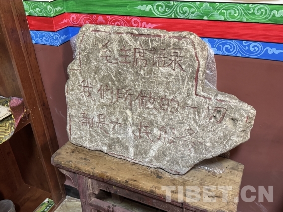 如今,松安寺內(nèi)有一座專門設(shè)立的紅色文物陳列室,長(zhǎng)青介紹道,這座紅色文物陳列室是現(xiàn)任活佛羅讓甲央在當(dāng)?shù)卣С窒禄I建而成。陳列室廣泛收集了有關(guān)紅色文物進(jìn)行集中展示,供僧眾和信教群眾參觀學(xué)習(xí)。有一塊石刻被視為“鎮(zhèn)館之寶”,上面刻著毛主席的語(yǔ)錄“我們所做的一切都是為人民服務(wù)”。石刻是寺廟在維修僧房時(shí)從房基下發(fā)現(xiàn)而挖出的,年代久遠(yuǎn),也見(jiàn)證了歷史里精神的傳承。