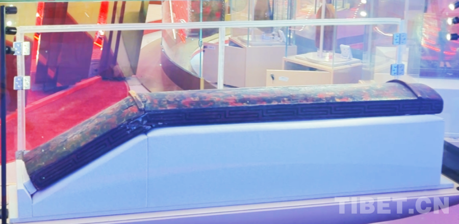 我們看到,雖然歷經千年,琴與長鼓仍色澤鮮艷,保存完好。整體呈亞腰形,兩端配備皮帶,可系于腰間,長鼓中間最細窄之處可系繩便于安置在樂器架上。其表面精巧地髹飾著朱漆與黑漆,巧妙地描繪出寶相牡丹花、云頭紋和火焰紋。而擁有同樣花紋的木琴一端斜下折出鈍角,更見巧思。雖然木琴兩道岳山間原本的琴弦因年代久遠沒有了,但我們仍仿佛能想象到,入藏后的演奏中,琴弦聲聲,有長安的溫婉綿長,也含雪域的雄渾遼闊,鼓聲陣陣,中原的節(jié)奏與雪域的韻律交織,和鳴穿越時空,在當下奏出和諧樂章。這兩件公主的嫁妝,早已不是單純的器物,更承載著深厚的歷史文化底蘊,成為民族文化交融的鮮活注腳。