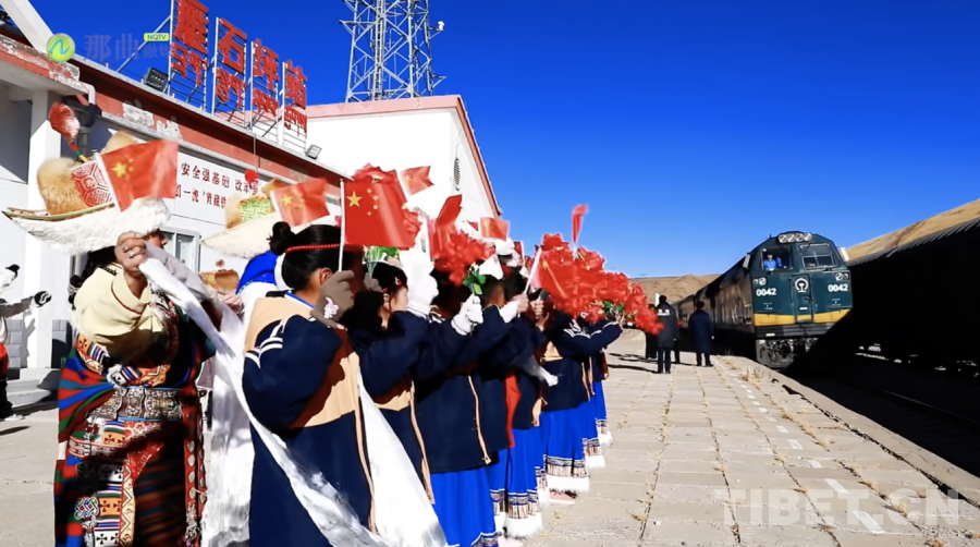 圖為首批旅客在雁石坪乘降所乘車(chē)遠(yuǎn)行 圖源:那曲融媒