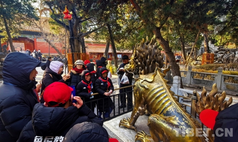 圖為西藏自治區(qū)那曲市色尼區(qū)青少年足球隊赴京研學(xué)團(tuán)的孩子們在了解故宮里的塑像 攝影:劉莉