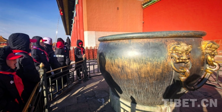 圖為西藏自治區(qū)那曲市色尼區(qū)青少年足球隊赴京研學(xué)團(tuán)的孩子們在了解故宮里以大銅缸為代表的消防設(shè)施 攝影:劉莉