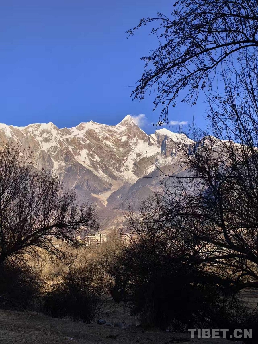 抵達(dá)江北臺(tái)地上的米林市派鎮(zhèn)索松村,四下極靜,連狗也慵懶。冬日的桃林枝干黝黑虬曲,客棧窗框恰好將南迦巴瓦納入其中。這座“羞女峰”唯有在冬日格外慷慨,終年云霧悄然散開,三角峰體全然顯露,陡峭決絕,雪色泛著亙古的金屬寒光。斜照之中,山體嶙峋的肌理清晰可辨,皺褶與陰影堅(jiān)硬而確鑿,令人頓生敬畏。