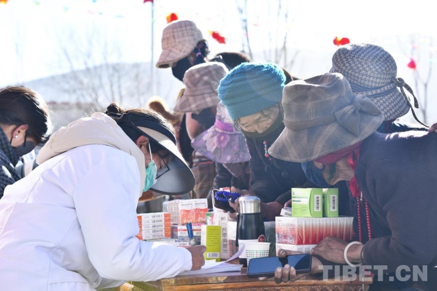 圖為拉孜縣錫欽鄉(xiāng)“村晚”現(xiàn)場(chǎng),醫(yī)生正在為村民們義診。攝影:趙振宇