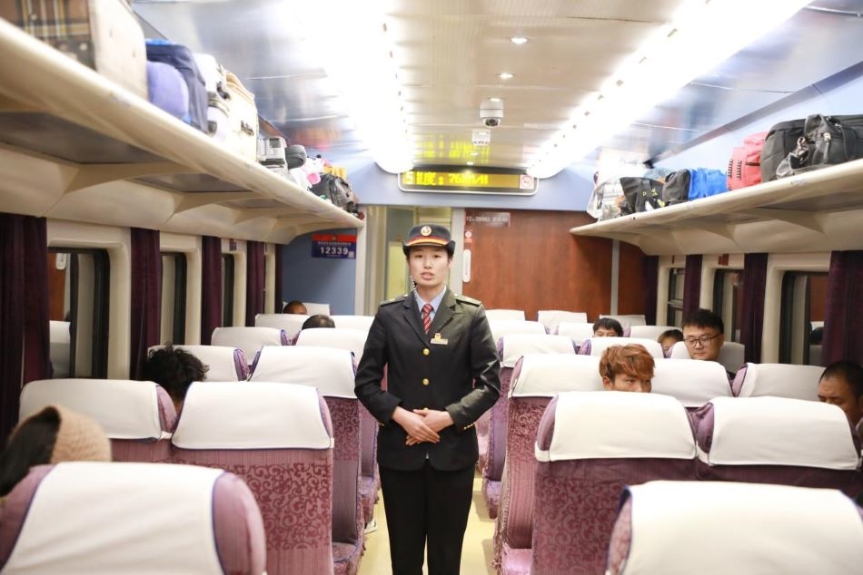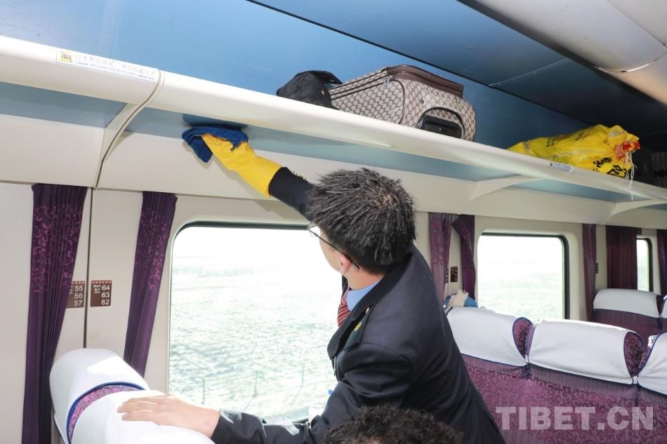 圖為乘務員在打掃車廂衛(wèi)生 攝影:陳衛(wèi)國