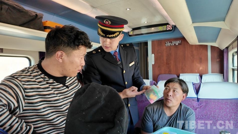 圖為乘務員用漢語、藏語、英語播報乘車注意事項 攝影:陳衛(wèi)國