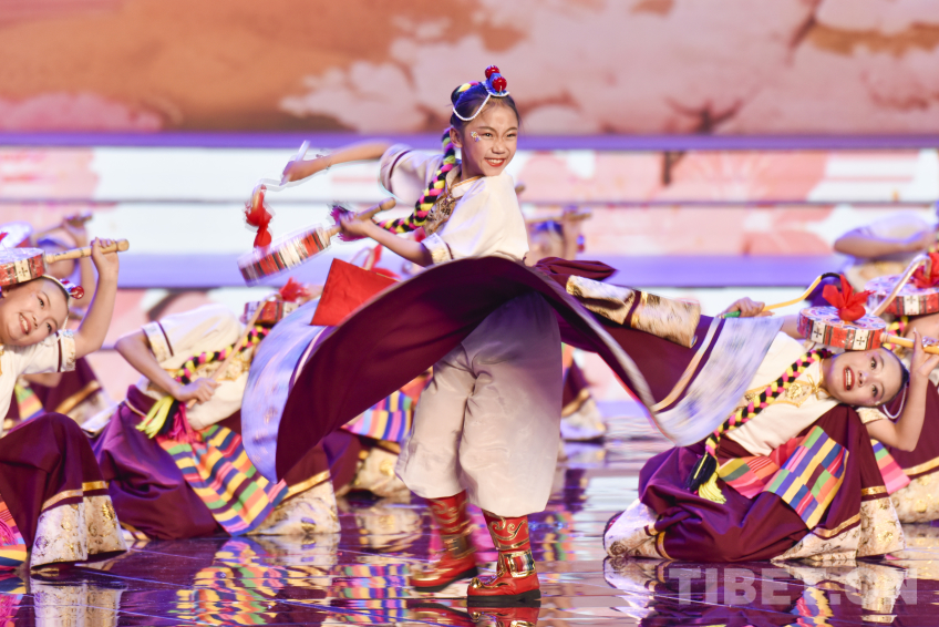圖為2026拉薩藏晚節(jié)目少兒舞蹈《鼓舞新時(shí)代》丹增珍美(中)與小伙伴一起為大家?guī)?lái)精彩熱巴舞 攝影:趙振宇