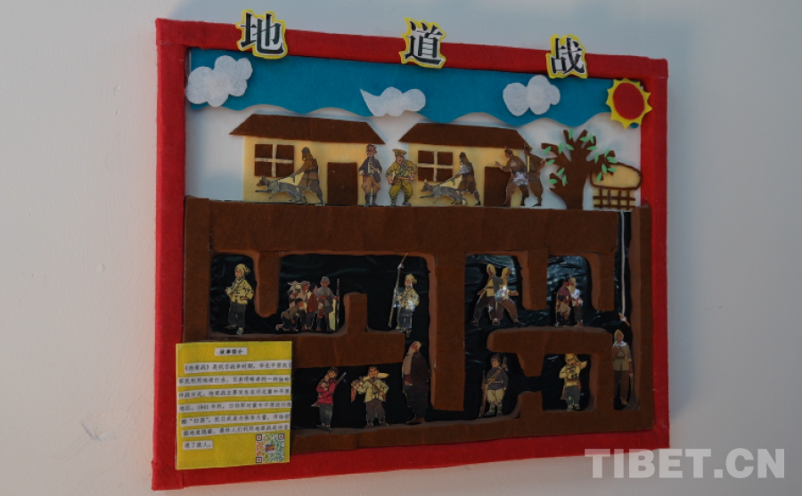 教學(xué)樓走廊與展示墻上,師生共同制作的民族團(tuán)結(jié)主題作品被悉心陳列。石榴花剪紙、多民族人物手工作品錯(cuò)落有致。《地道戰(zhàn)》“黃繼光”“劉胡蘭”等英雄故事被制作成形象生動(dòng)的手工作品,人物形象鮮活,配有簡(jiǎn)介,讓孩子們一看便知主要故事情節(jié)?!爸谱鲿r(shí)我們用了很多廢舊材料,比如開(kāi)心果殼,涂上顏料就成了作品上的點(diǎn)綴?!?/span>幼兒園教師介紹道。