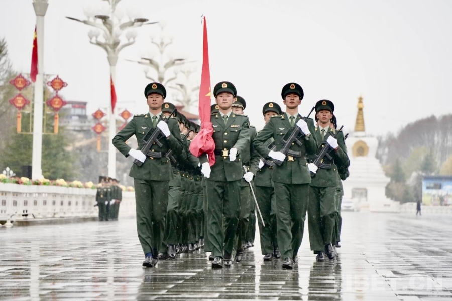 中國西藏網(wǎng)訊 雨雪紛飛,紅旗獵獵,布達(dá)拉宮廣場在飛雪中更顯莊嚴(yán)。3月28日上午,西藏自治區(qū)各族各界干部群眾在拉薩布達(dá)拉宮廣場參加升旗儀式,慶祝西藏百萬農(nóng)奴解放紀(jì)念日。