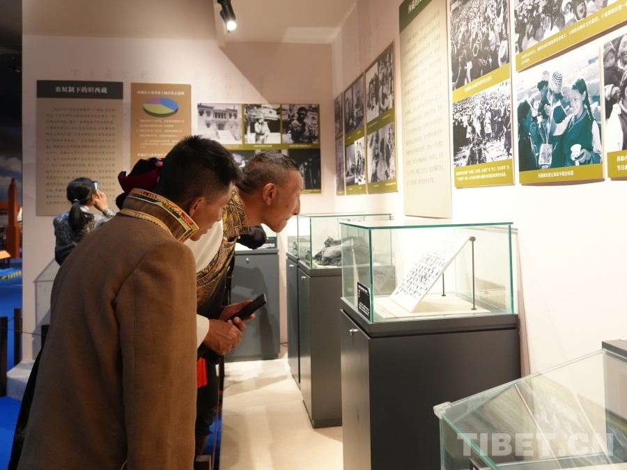 在民族文化宮,山南基層群眾觀看有關(guān)西藏農(nóng)奴解放的展覽 攝影:王茜