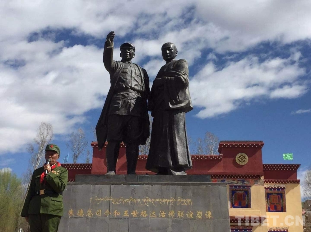 圖為洛絨志麥在烈士雕塑前給學生講英烈故事 攝影:葉強平